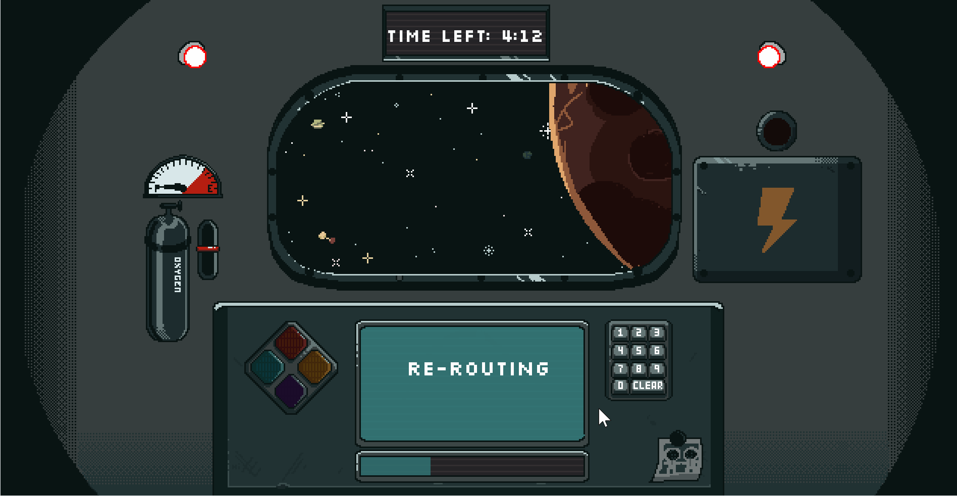 Solve puzzles in five minutes to re-route your ship from the oncoming asteroid